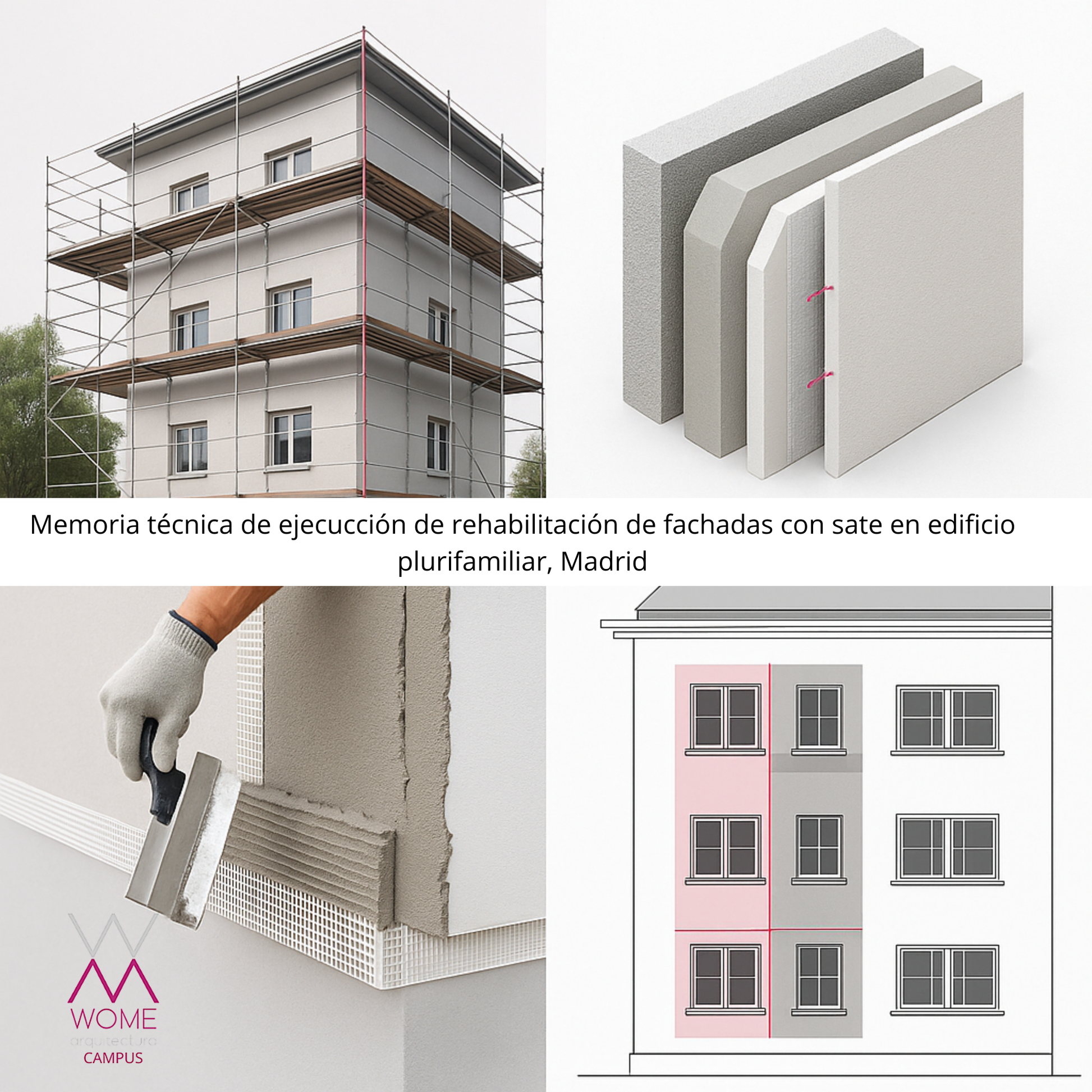 WM001 Documento técnico detallado para la ejecución de obras de rehabilitación de fachadas mediante sistema SATE en edificios plurifamiliares ubicados en Madrid. Incluye descripción de trabajos, materiales, cumplimiento del CTE, normativa municipal y mejora del comportamiento térmico del edificio.